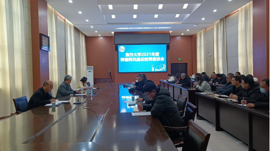 为深入学习贯彻习近平新时代中国特色社会主义思想,落实习近平总书记球王会平台教育的重要论述,扎实推进新时代教师队伍建设,建立健全师德师风长效机制,12月16日下午,学校在行政楼201会议室召开2021年师德师风建设专题座谈会。本次会议以“立德树人,德法兼修,争做新时代‘四有’好老师”为主题,校党委副书记、工会主席符德学出席会议并讲话,各教学院部、相关职能部门负责人及教师代表近40人参加会议。会议由人事处(党委教师工作部)处长霍霄艳主持。
